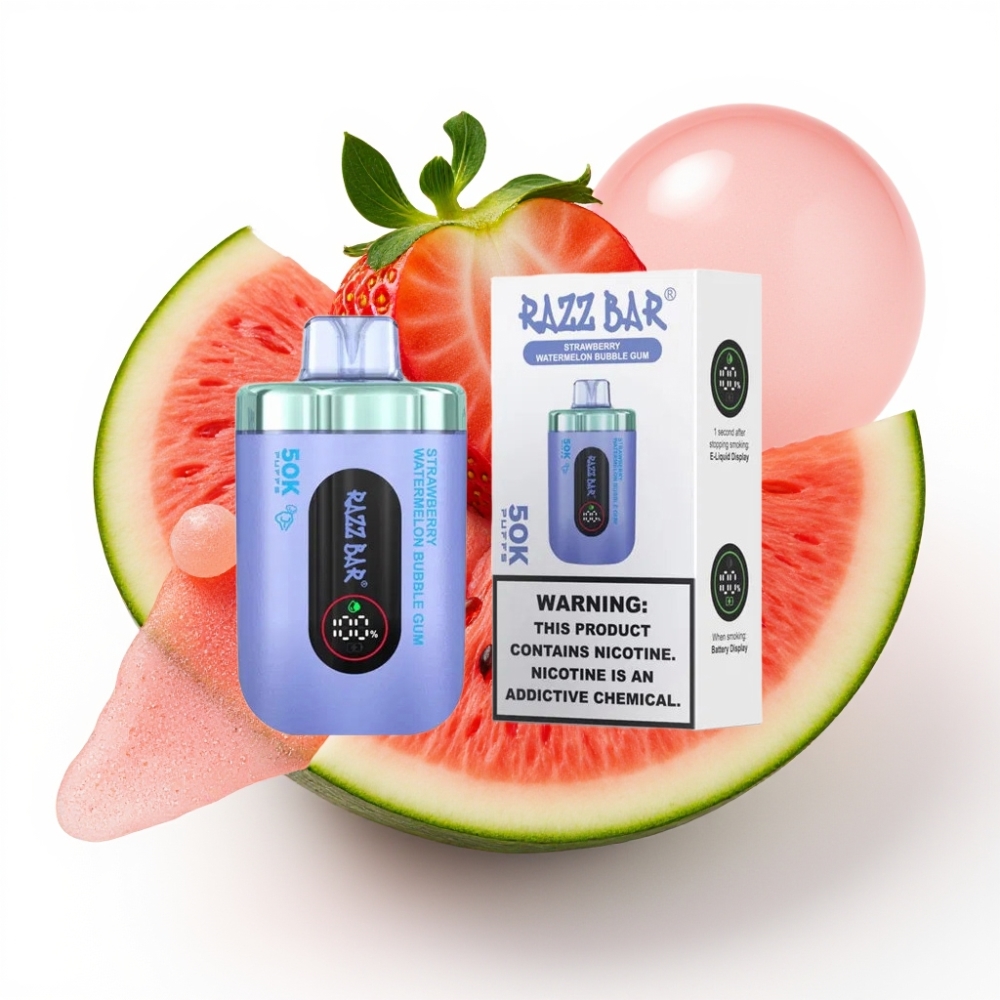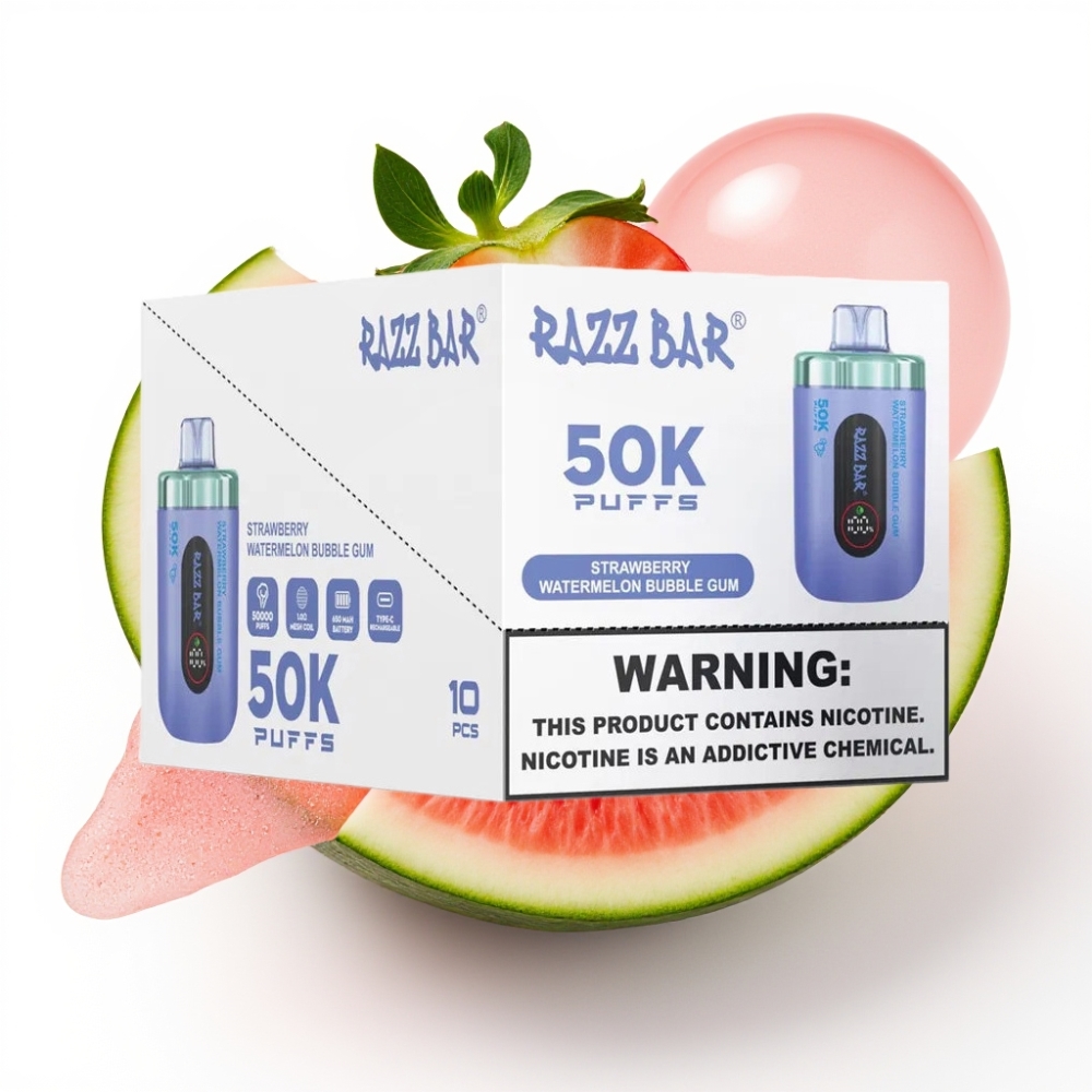 Razz Bar 50K Puffs Disposable Vape Type-C Rechargeable Zemeņu Arbūza Bubble Gum
